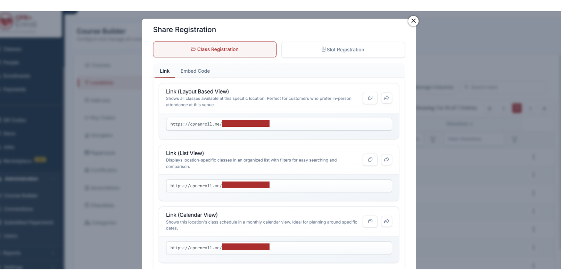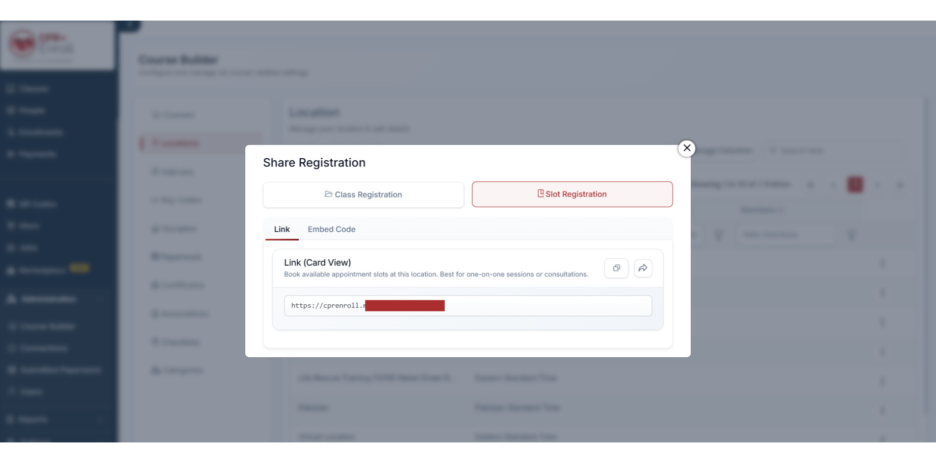 Under Slot Registration, you can copy the link for the Card View to let students book one-on-one sessions or consultations at that specific site.