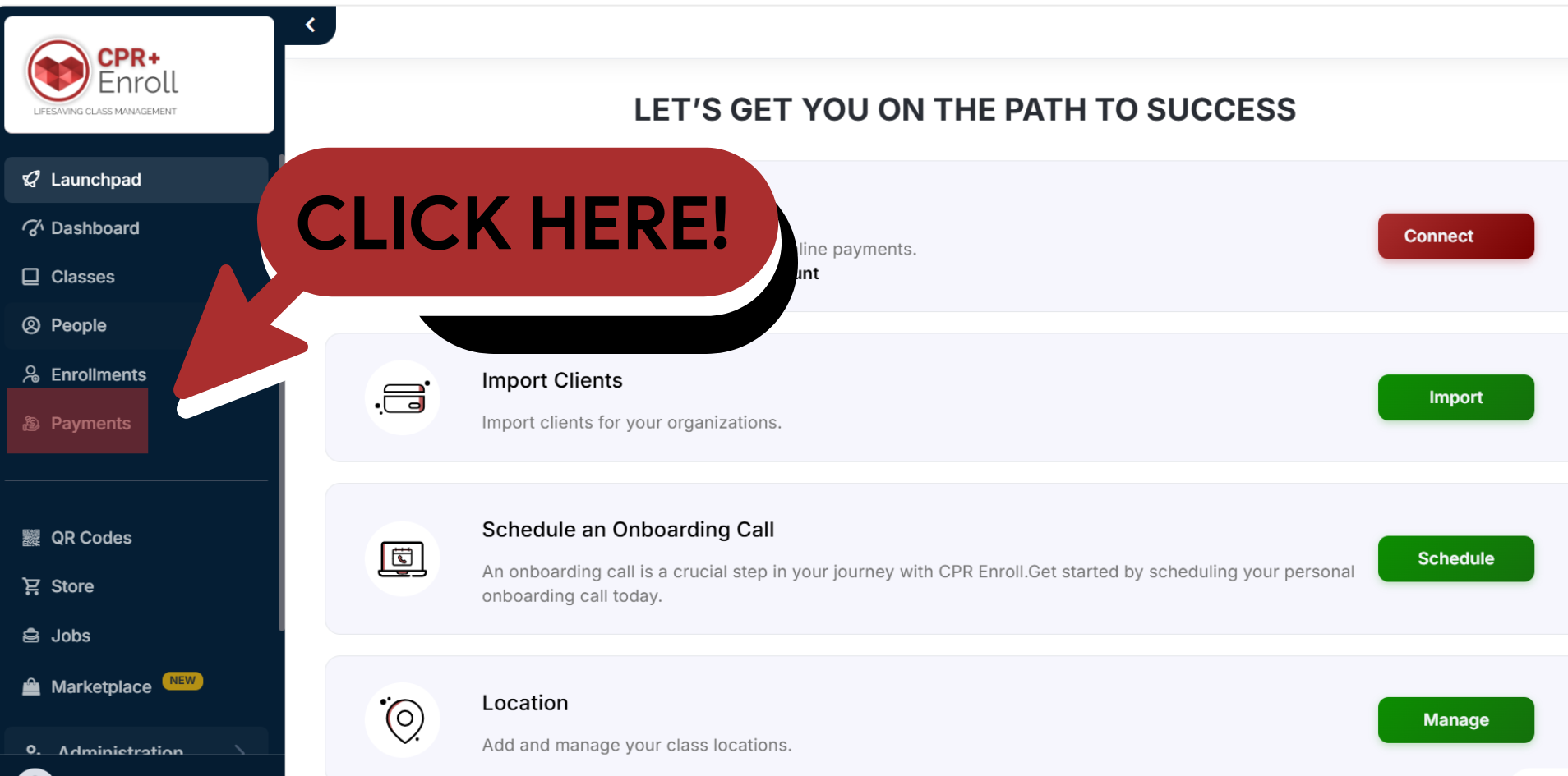 Navigate to Payments: From the CPR Enroll Launchpad, locate the Payments option in the left-hand menu, situated directly below "Enrollments."