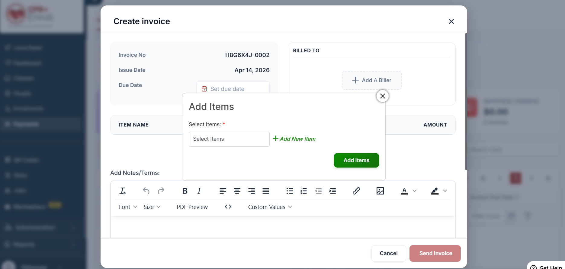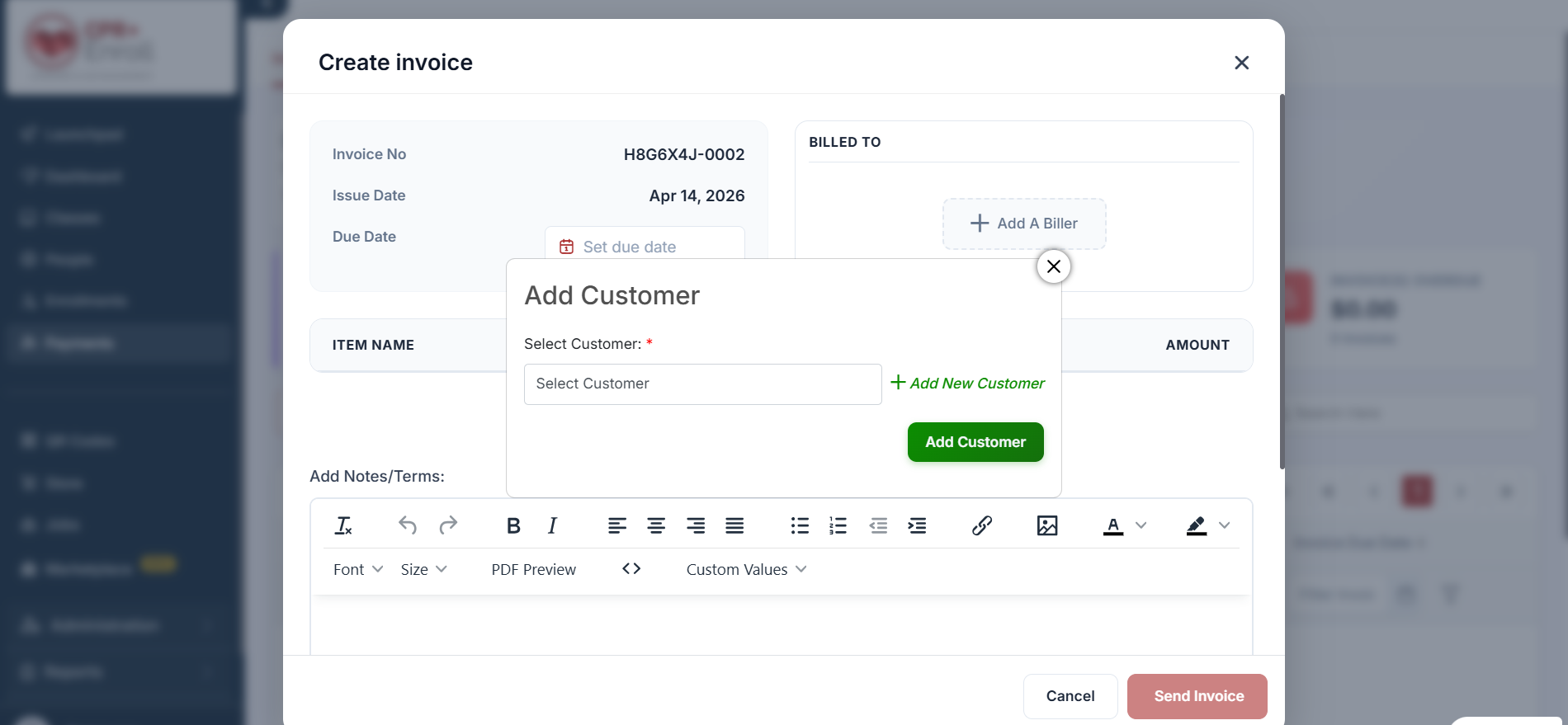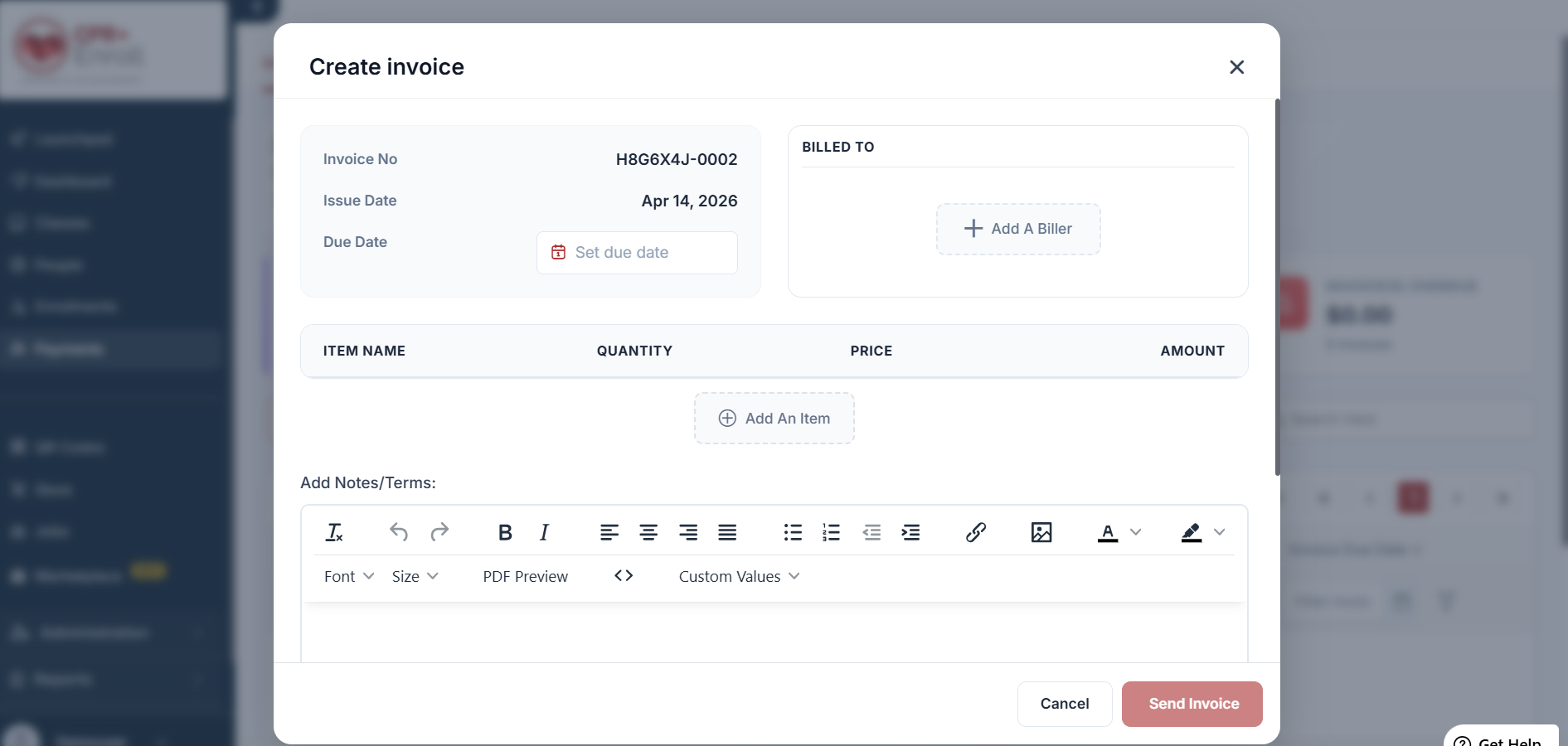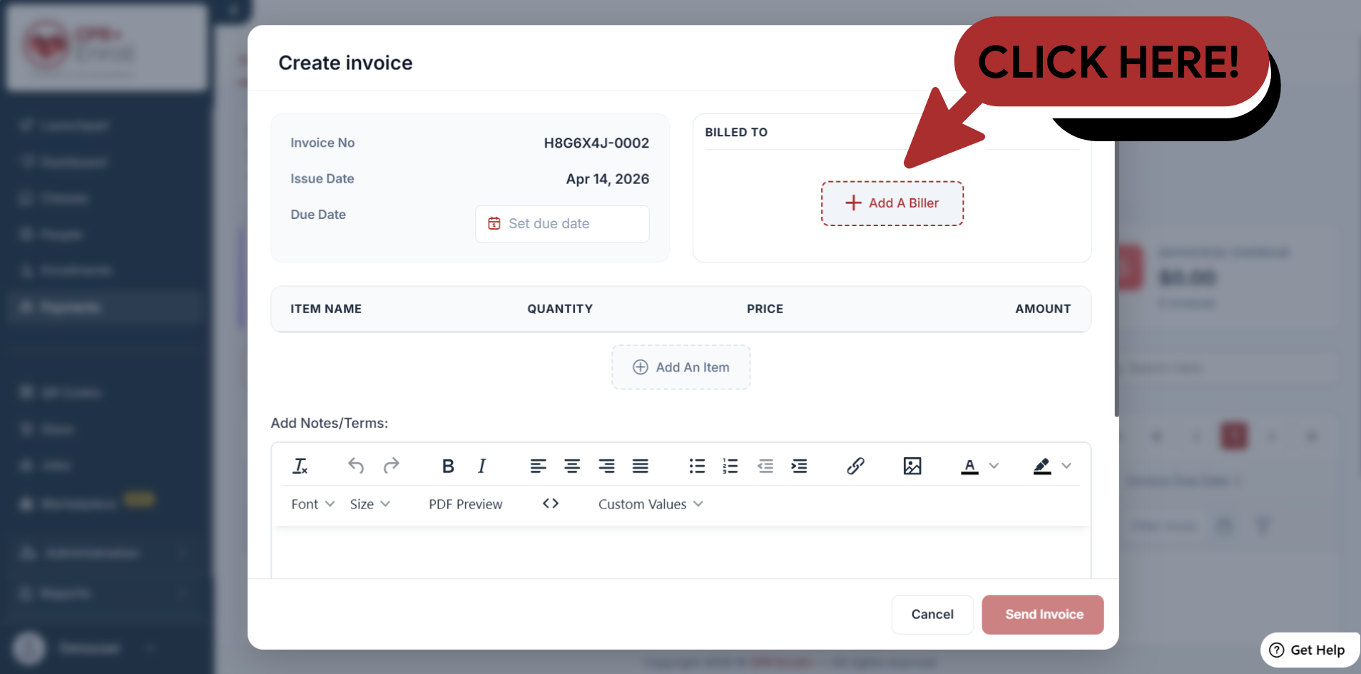 Identify the Recipient: In the Billed To section, click + Add A Biller to select or enter the details of the individual or organization receiving the invoice.