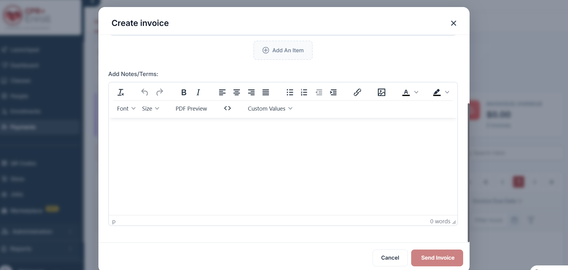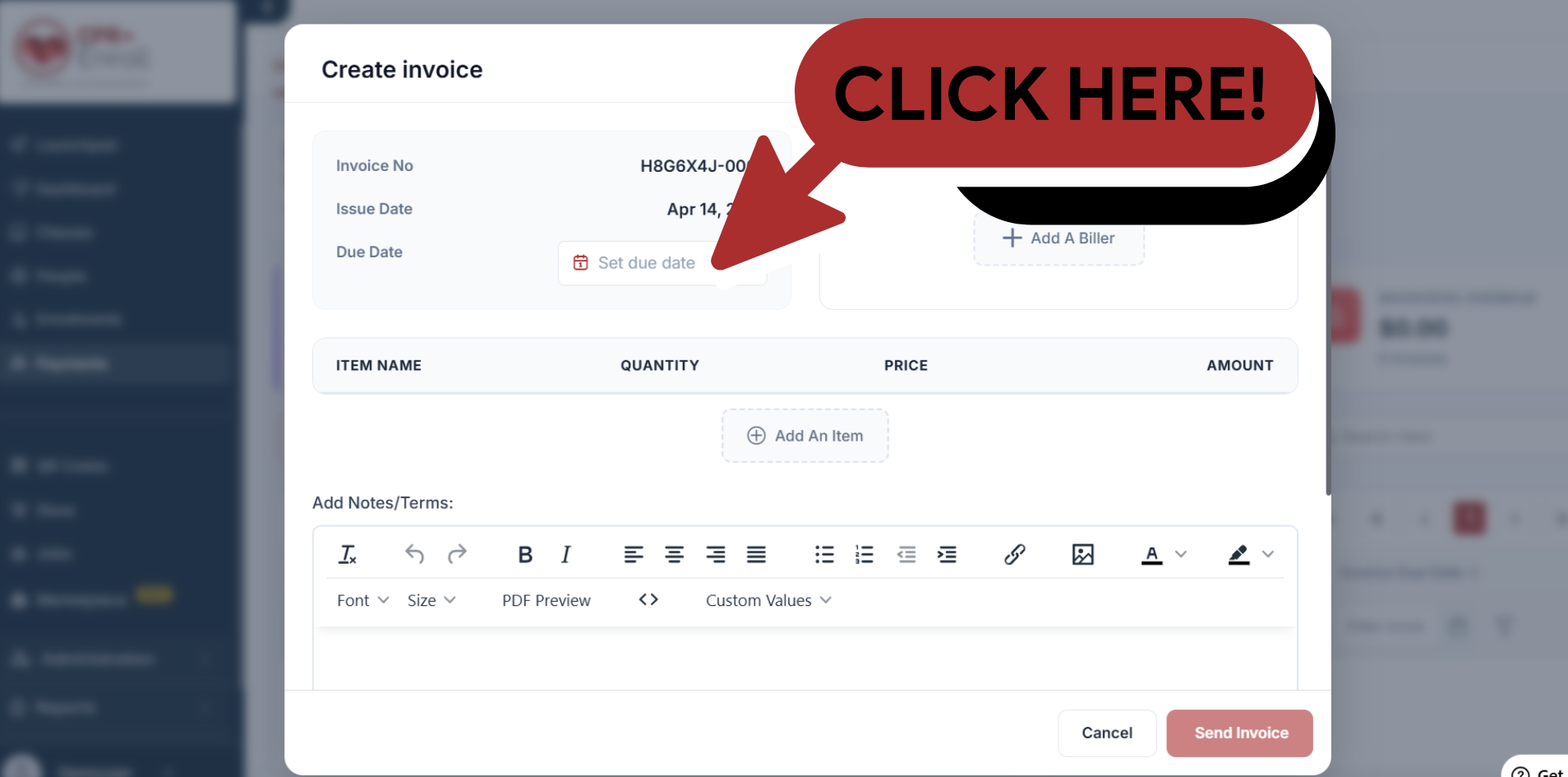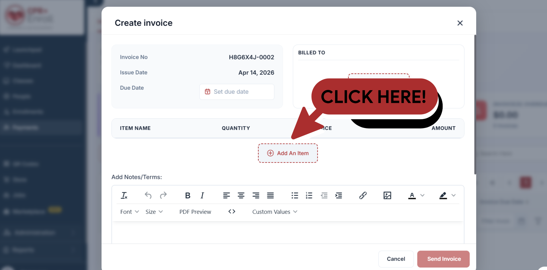 Add Products or Services: Click + Add An Item to list the specific courses, certifications, or products you are billing for. You can add multiple line items if necessary.